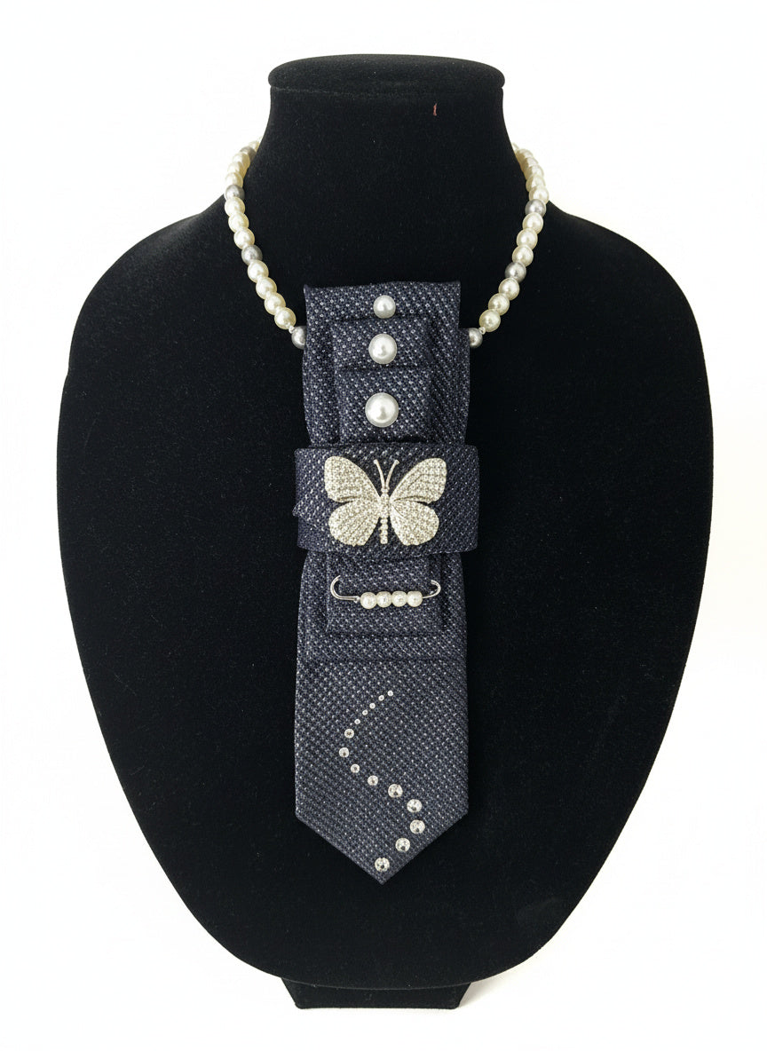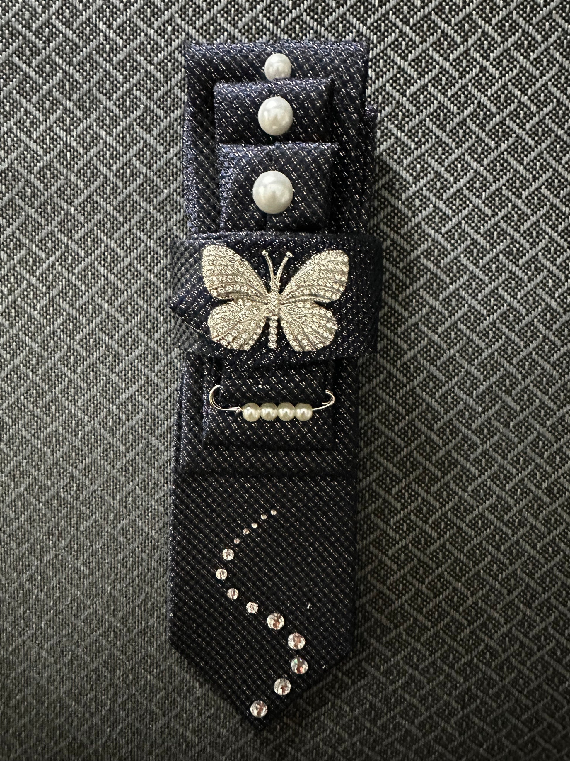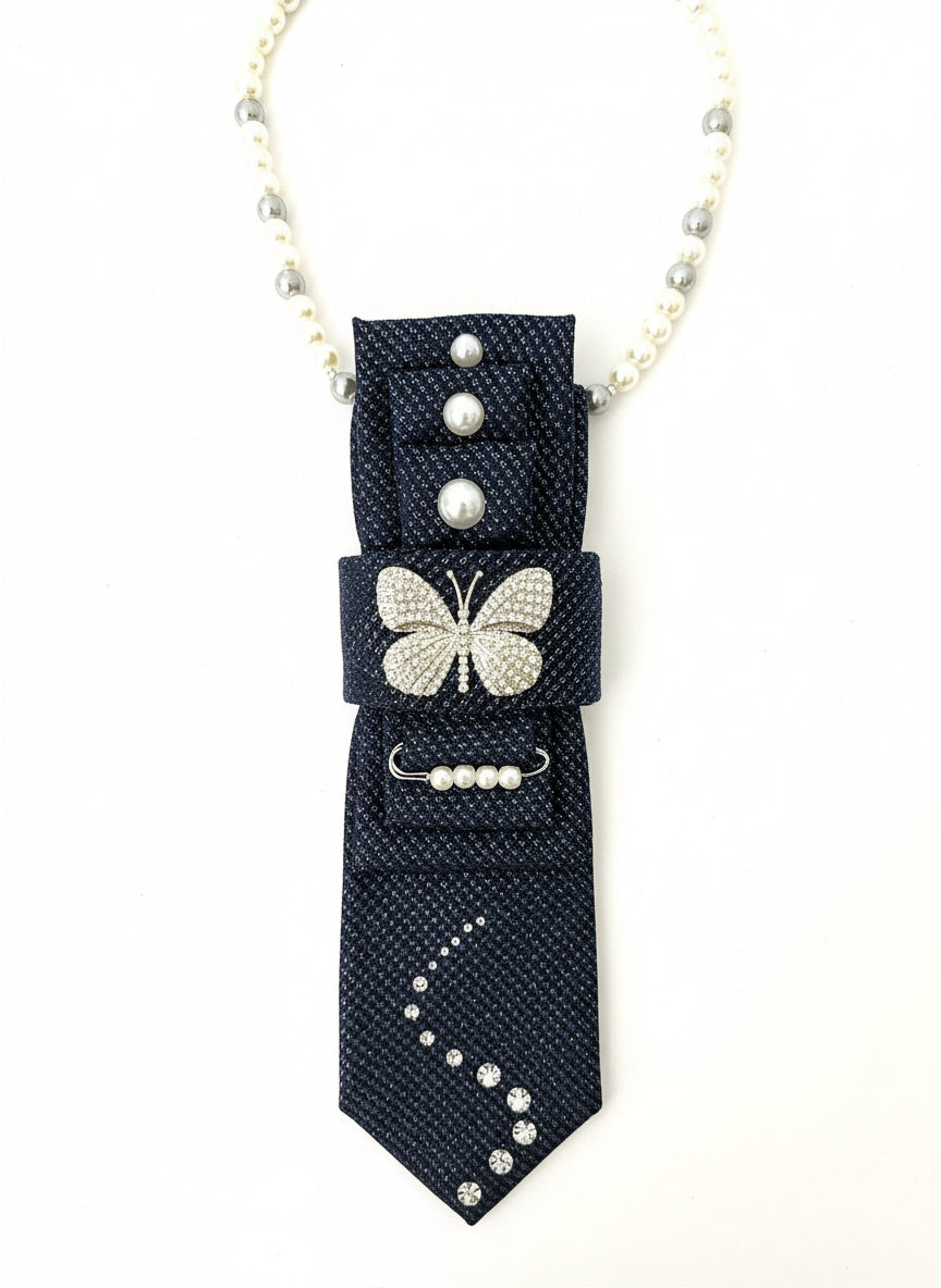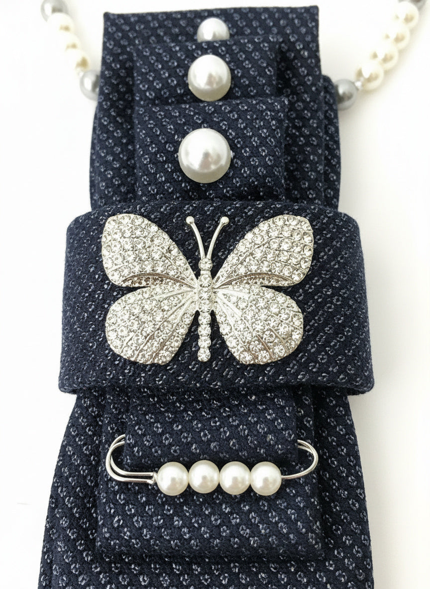 Designed with a textured deep-navy tie fabric, this piece is paired with a pearl-accented necklace strand that frames the neckline with timeless sophistication. At the center sits a dazzling crystal butterfly motif, symbolizing transformation and grace, intricately set with shimmering stones that catch the light beautifully.