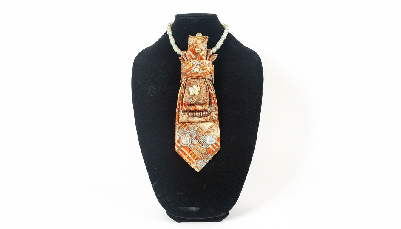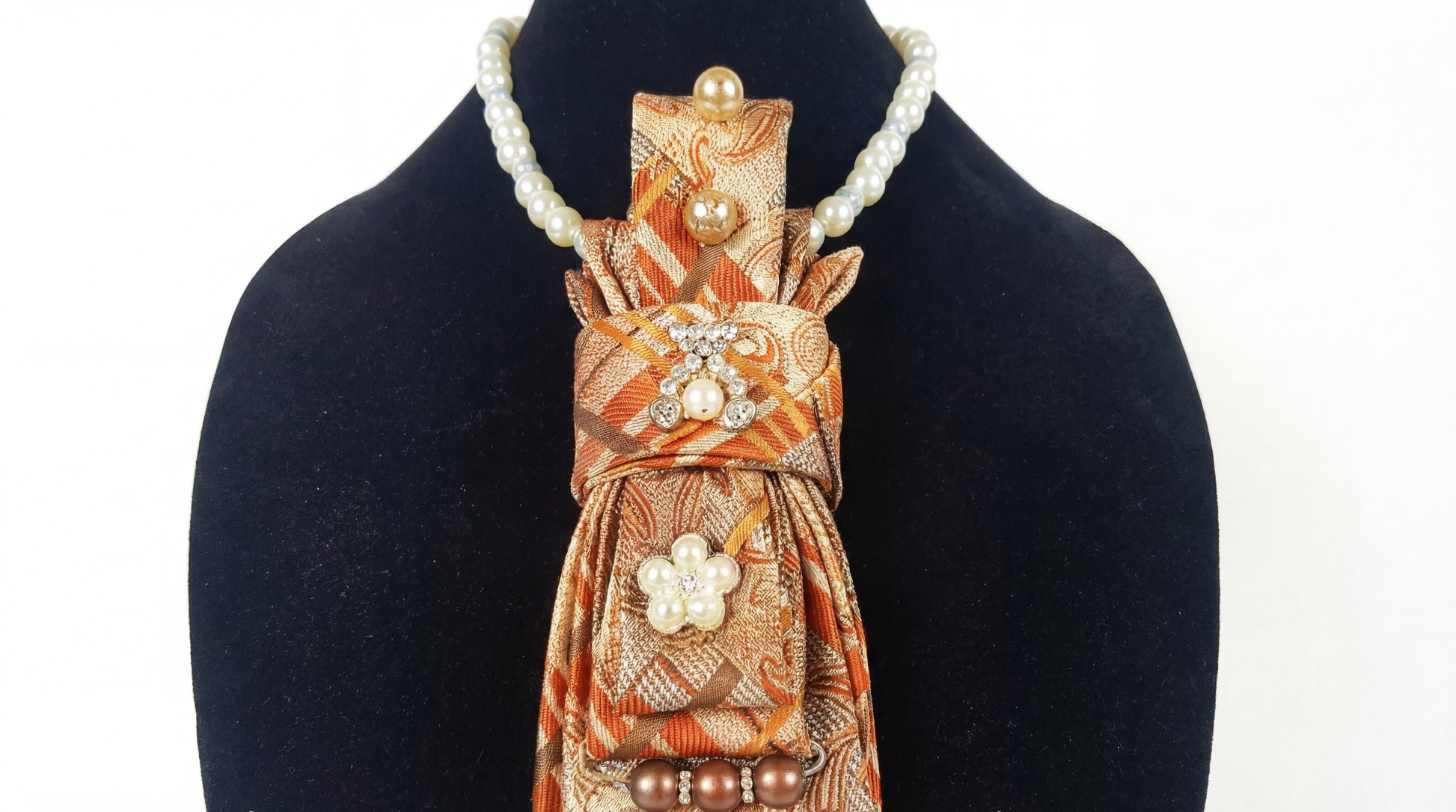 This couture-inspired statement tie necklace blends rich autumn tones with intricate detailing for a look that feels both powerful and feminine. Designed in a luxurious copper, gold, and soft brown paisley-patterned fabric, this piece radiates warmth and refined texture.