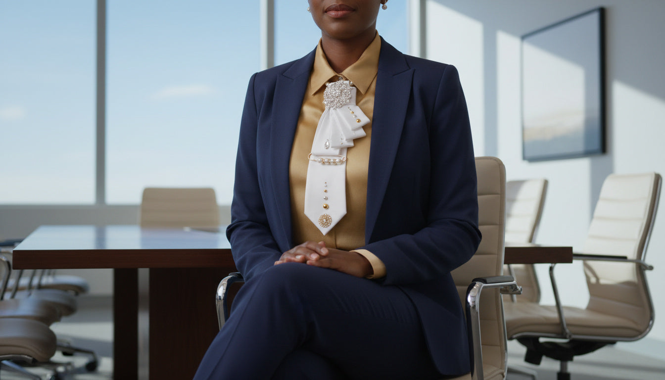 Layered pleated accents add soft movement and couture-inspired texture, while carefully placed crystal and pearl details cascade down the tie for a balanced, elongated look. A gold-tone safety pin detail adorned with pearls introduces a modern, fashion-forward edge—blending classic elegance with contemporary styling. The design is finished with a gold and crystal medallion at the pointed tip for a polished, regal touch.