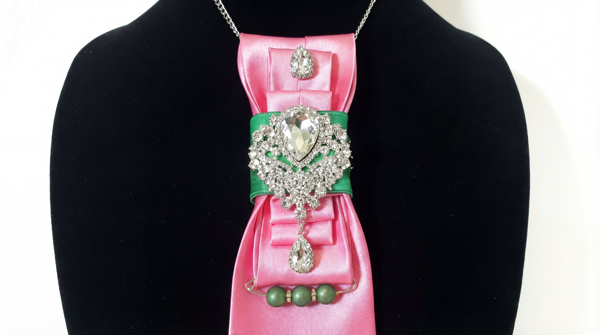 At the center, a rich emerald-green band anchors an ornate crystal brooch featuring layered stones and a teardrop pendant drop. The contrast of pink and green delivers a striking, couture-inspired palette that feels both playful and powerful.
