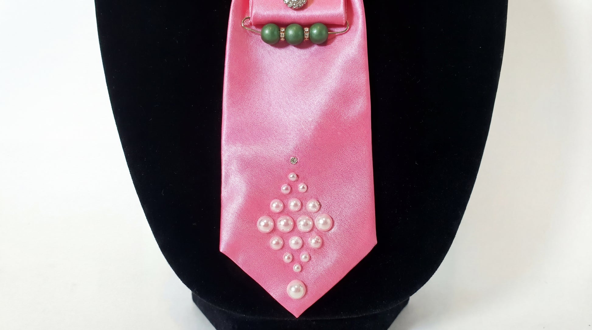 Just beneath the centerpiece, matte green bead accents add dimension and depth, while a cascade of pearl embellishments at the tip softens the silhouette with a graceful finish.