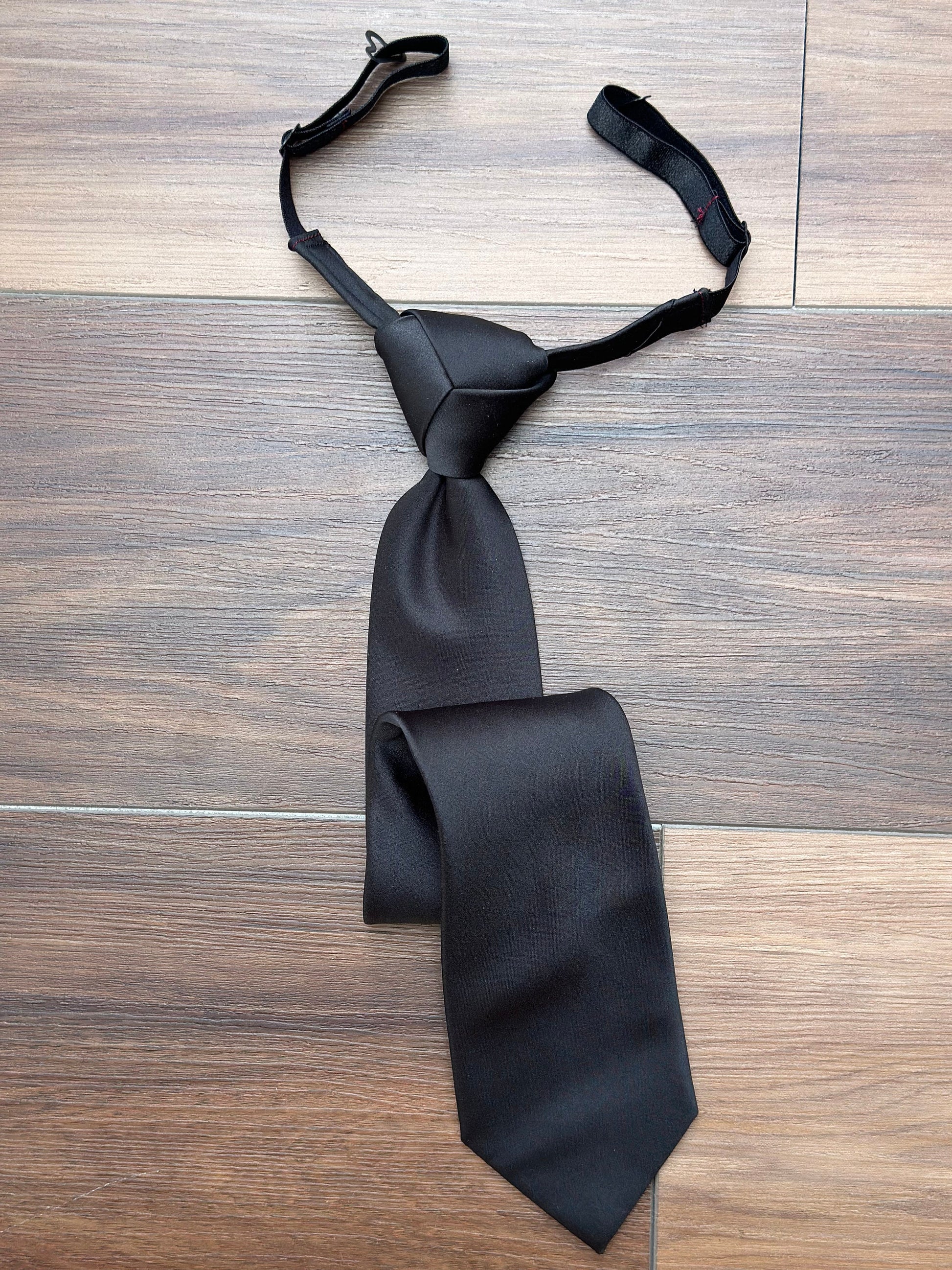 and the tie clips on like a bow tie, making it very easy to wear and remove when it